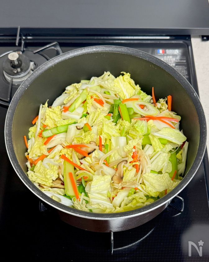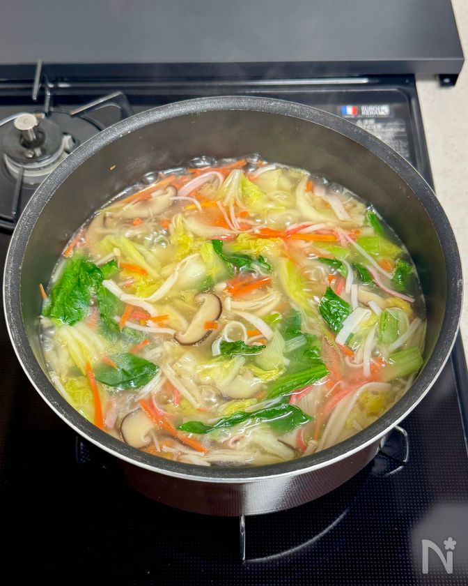 (4) それぞれ火が通ったら、水と【A】を加えてひと煮立ちさせ、カニかま、小松菜の葉を加える。