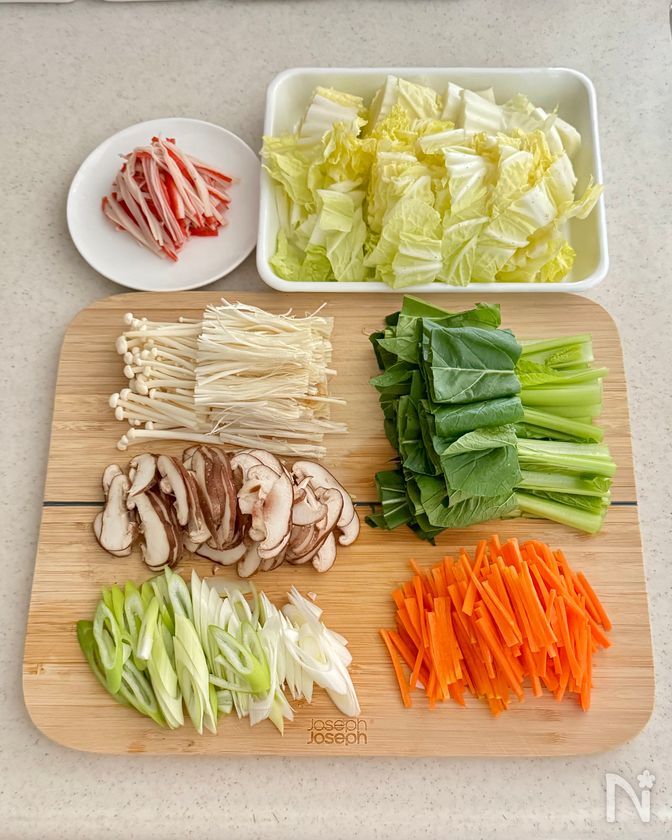 (1) 白菜はざく切り、人参は細切りにする。小松菜は4cmの長さに切り、茎と葉の部分に分けておく。長ネギは斜めの薄切りに、しいたけは石突きを取り薄切りにする。えのき茸は石突きを取り、縦半分に切ってほぐす。カニかまはほぐしておく。
