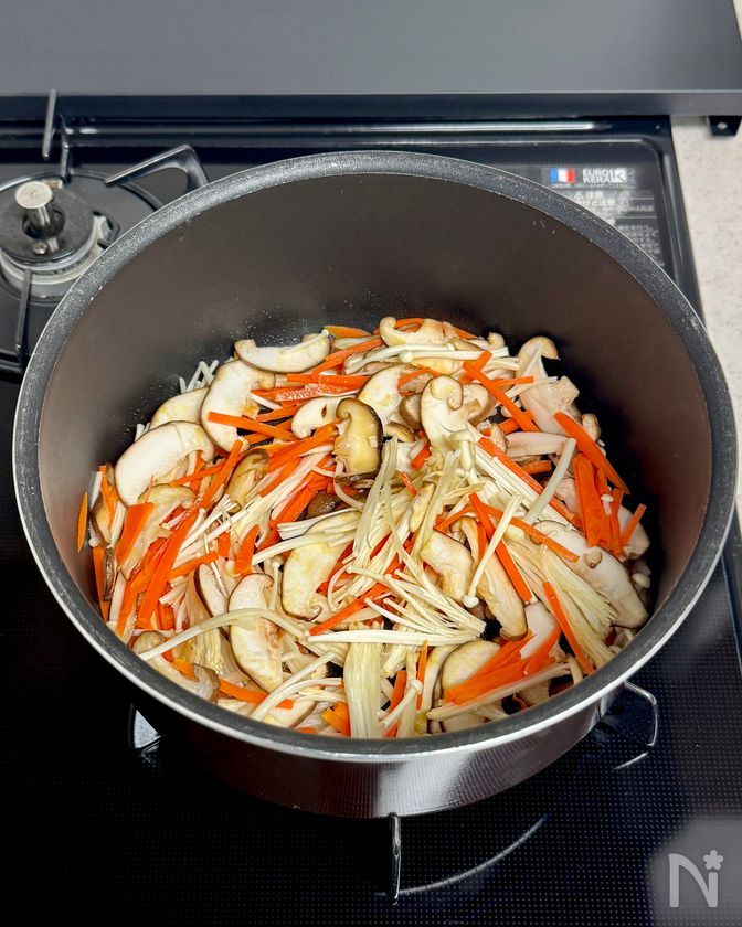 (2) 鍋を中火にかけて半量のごま油(小さじ1)をひき、人参、しいたけ、えのき茸を炒める。