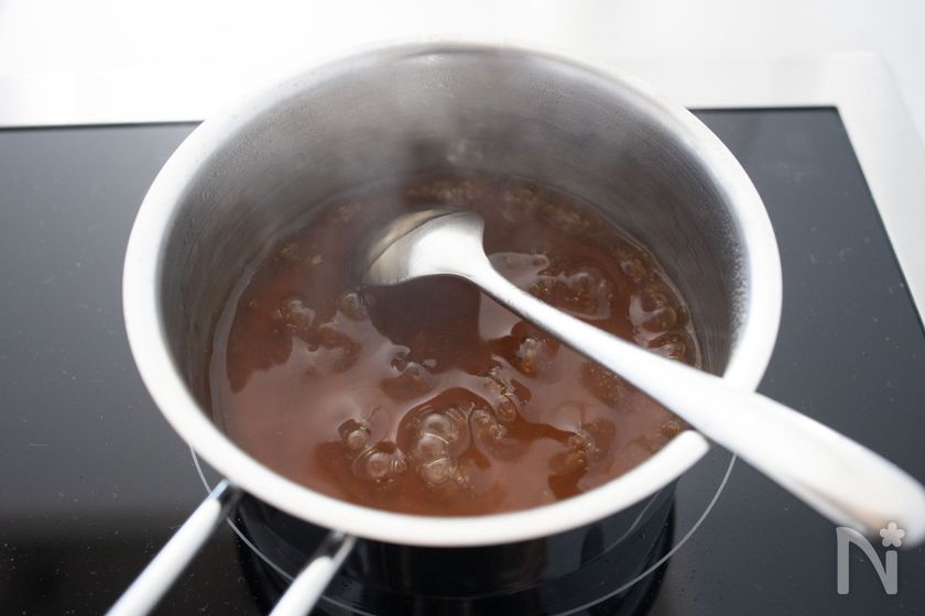 (3) あんを作る。小鍋に【B】を入れて火にかけ、煮立ってきたらよく混ぜ合わせた【C】でとろみをつける。
