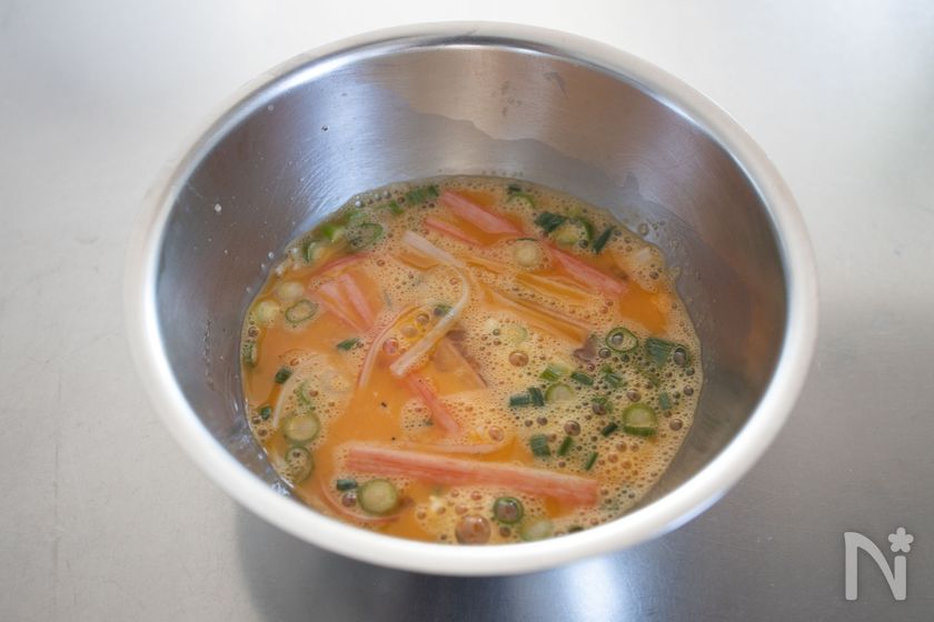 (1) カニカマは割く。ボウルに【A】を入れてよく溶きほぐし、カニカマと薬味ねぎ(小口切り)を加えて混ぜる。