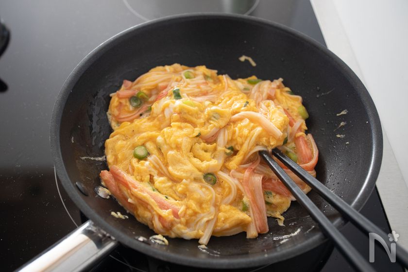 (2) フライパンにサラダ油を中火でよく熱し、1を流し入れる。菜箸で円を大きく描くようにぐるぐると混ぜ、半熟状になったら火を止めて器に盛り付ける。