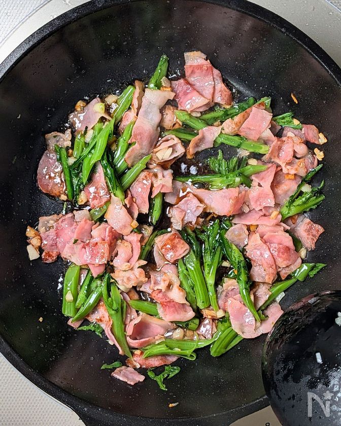 (3) ベーコンに焼き色がついたら春菊の茎を加えて炒め、しんなりしたらぽん酢を加えて火を止める