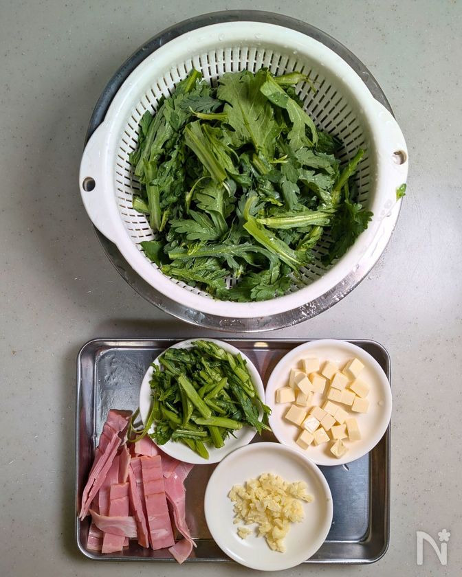 (1) 春菊の葉を茎から外し、食べやすい大きさにちぎる。茎は斜め切りにする。