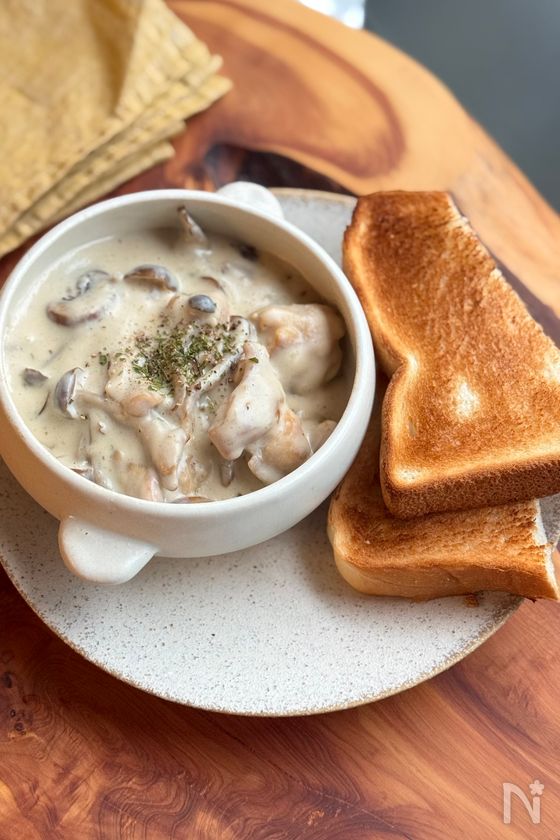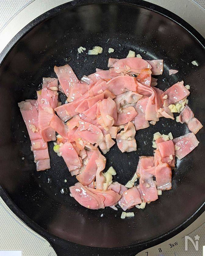 ・にんにくとベーコンを炒めると油が跳ねます。火傷には注意してください。