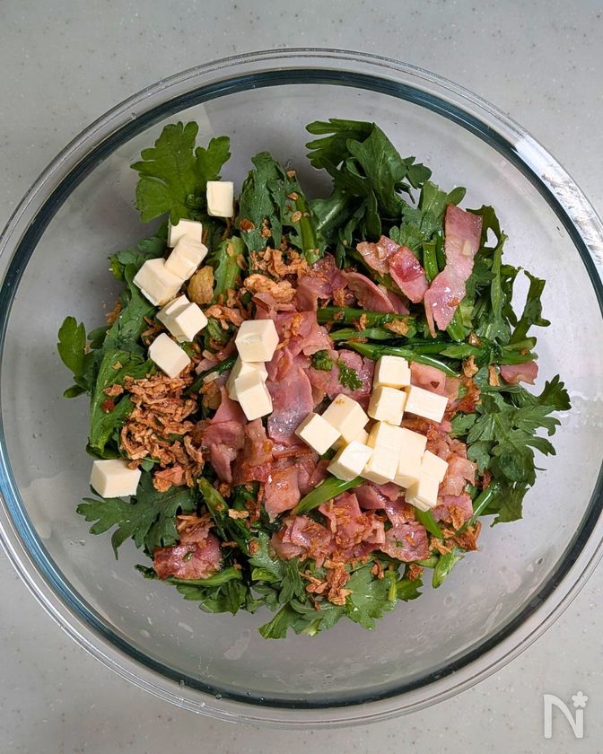 (4) ボウルに春菊の葉を入れ、③・チーズ・フライドオニオンを加えて和える。