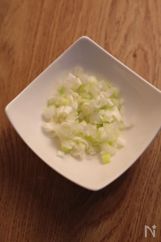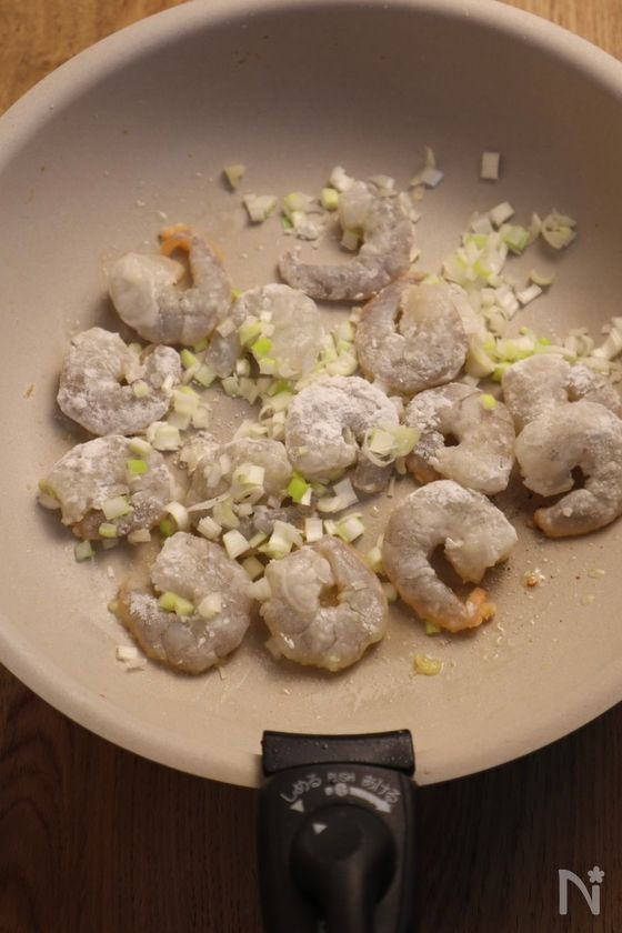 (2) 中火で熱したフライパンにごま油をひき、にんにくチューブを入れ、香りが立ってきたら、長ネギとえびを入れえびの色が変わるまで炒める。