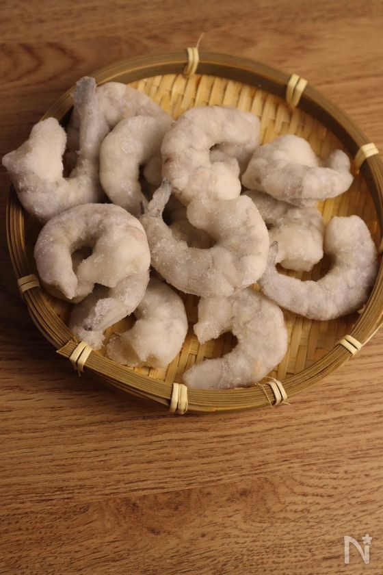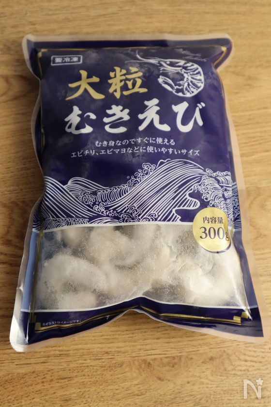 (5) 業務スーパーの大粒むきえびを使用しました。直径約5cmほどの大粒えびがむき身になっており、背ワタ処理済みですぐに使えるのが嬉しいポイント。プリッとした食感でクセがなく、食べ応えも抜群です。冷凍庫にストックしておけば、使いたい時にサッと調理できるのも魅力。