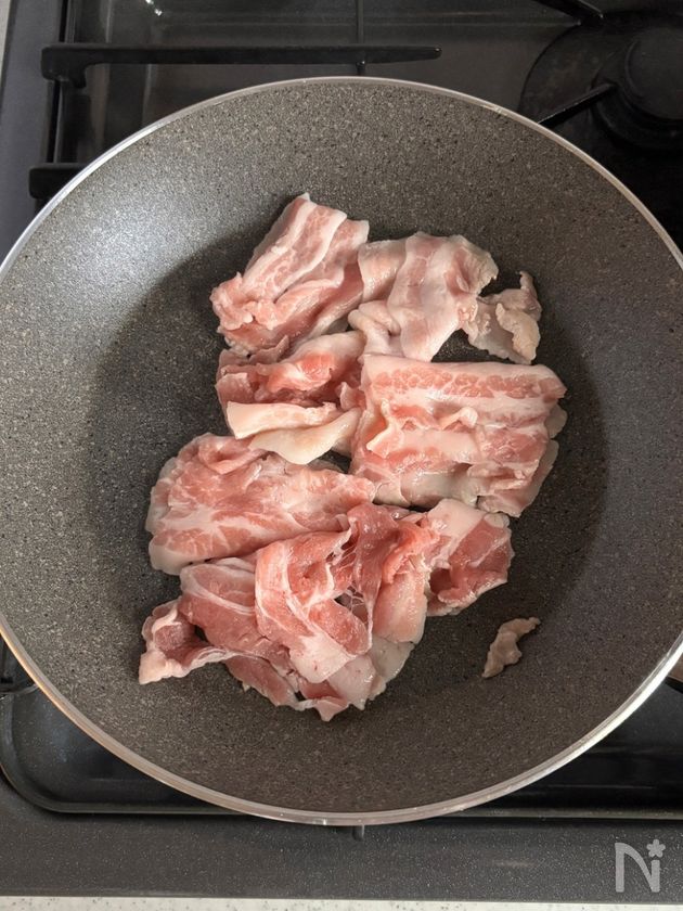 (2) 同じフライパンに豚バラ薄切り肉を入れ、中火で炒める。