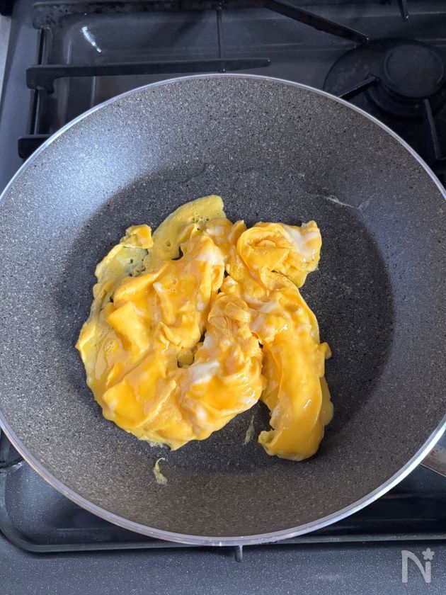 (1) フライパンにサラダ油を中火で熱し、溶き卵を流し入れる。大きく混ぜて半熟状になったら一度取り出す。