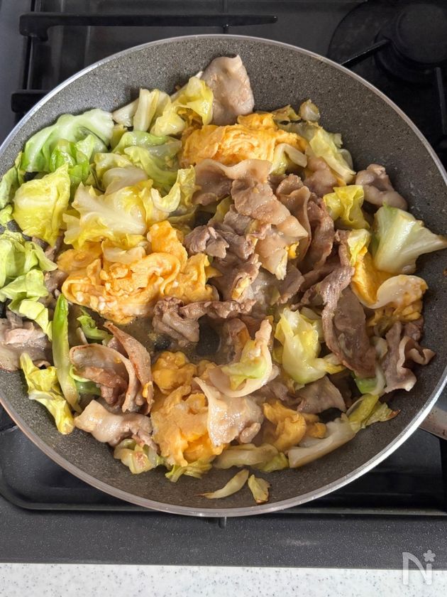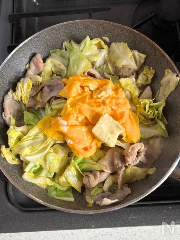 ごはんが止まらない!春キャベツと豚バラのガリバタふわ玉炒め
