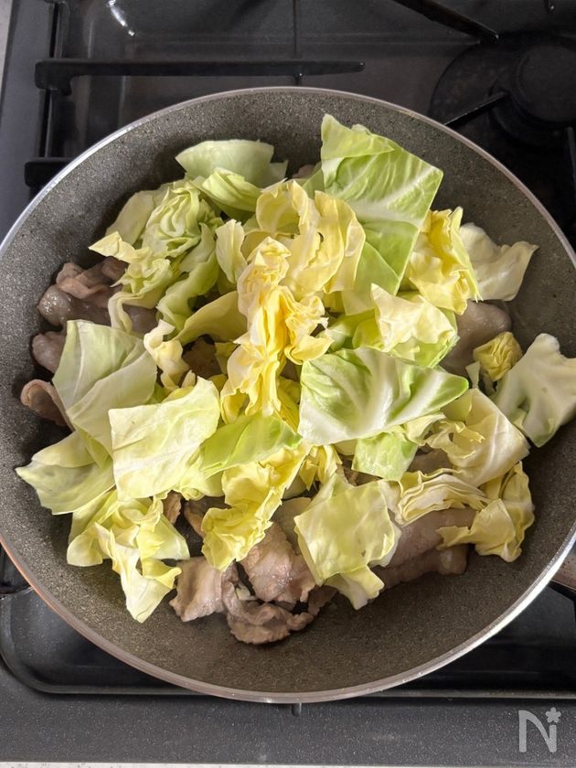(3) 肉の色が変わったら春キャベツを加え、さっと炒める。