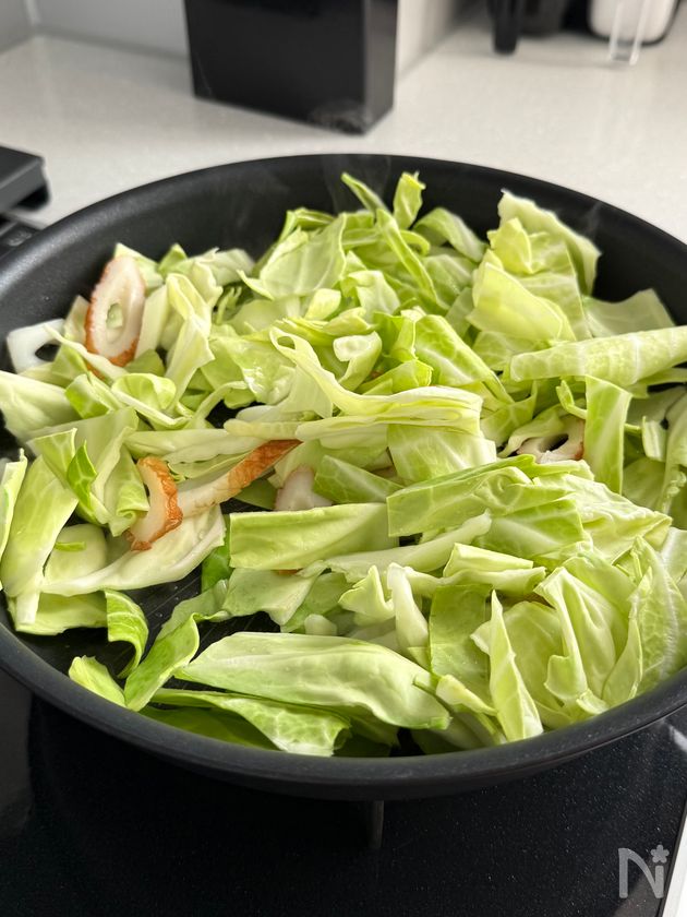 (2) フライパンにごま油を中火で熱し、キャベツとちくわを入れてさっと炒めて焼きつける。