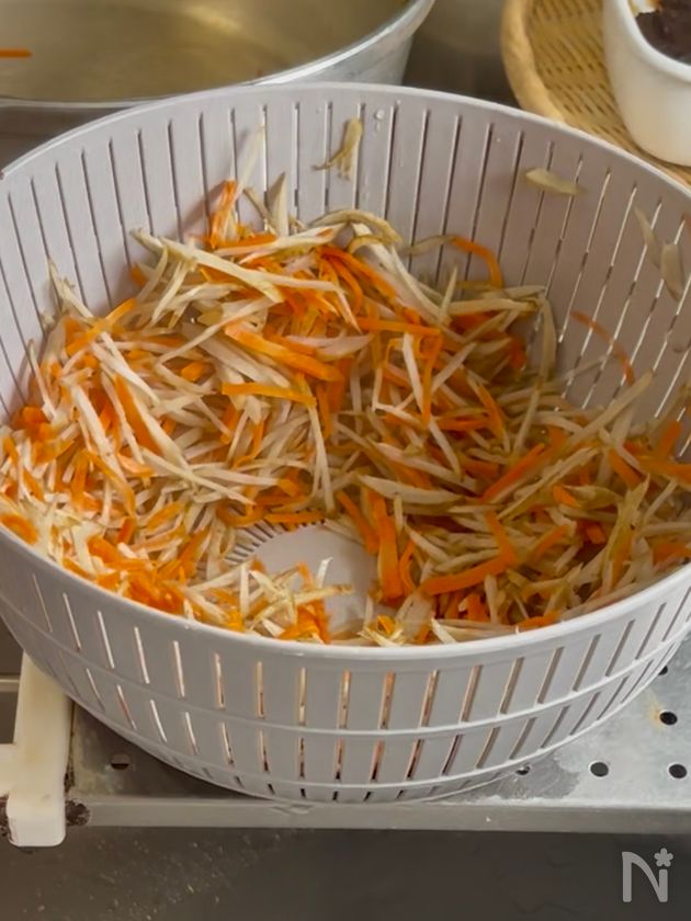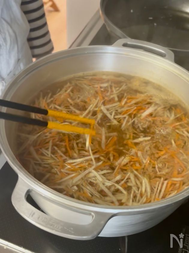 (2) 人参と新ごぼうは水から茹で沸騰させ、