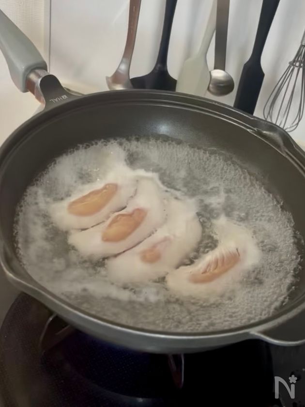 (1) 鍋に湯を沸かし、塩をひとつまみ(分量外)とささみを入れ1分茹でる。
