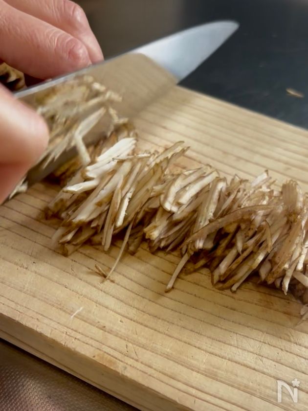 ●筋は取らずに茹で、ほぐす時に取る、でOK(始めに取り除いても可)