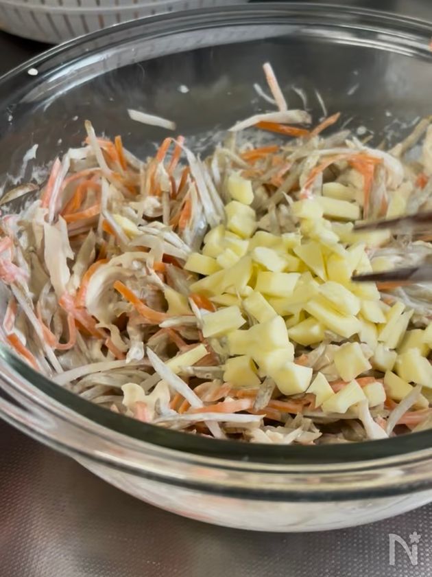 (4) ボウルに【A】を合わせ①と③、キャンディチーズ切って入れ、和えたら完成。