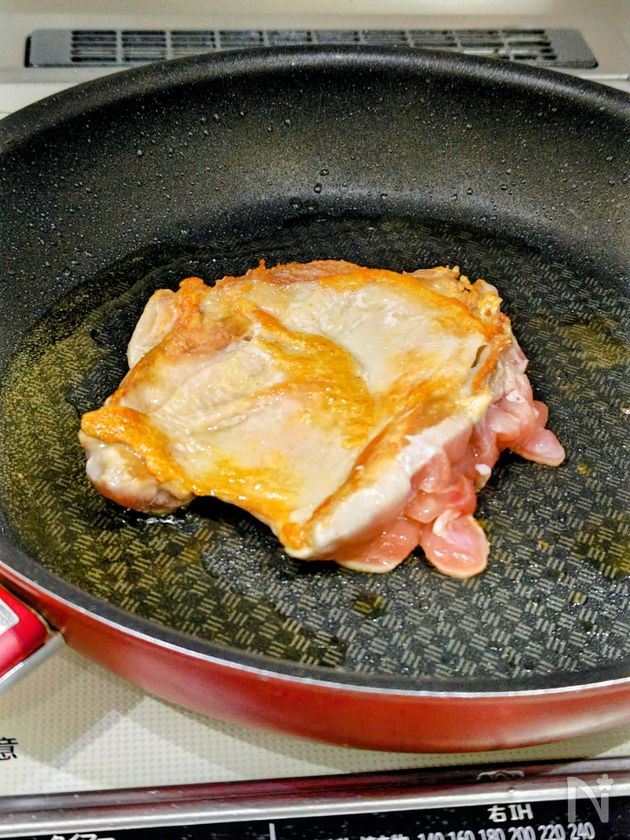 (1) フライパンに米油を入れ、鶏もも肉を皮を下にして置く。