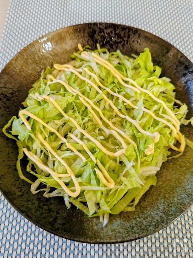 (下準備) 千切りにしたレタスを皿に盛り付けておく。