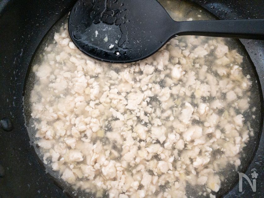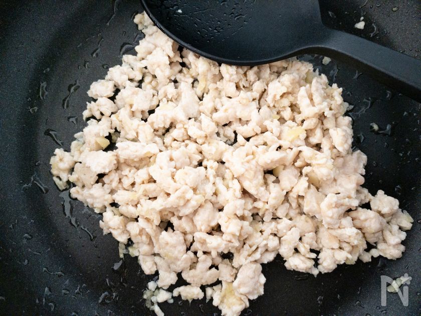 ごま油をひいたフライパンを熱し、生姜を炒める。次いで、鶏ひき肉を加えて中火で2分炒める。