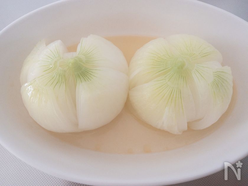 (下準備) 新玉ねぎは上下を切り落とし、半分位の深さまで十字に切り込みをいれる。耐熱皿に入れて、【A】を新玉ねぎの上から均等にかけてふんわりとラップし、600Wのレンジで6分程加熱する。