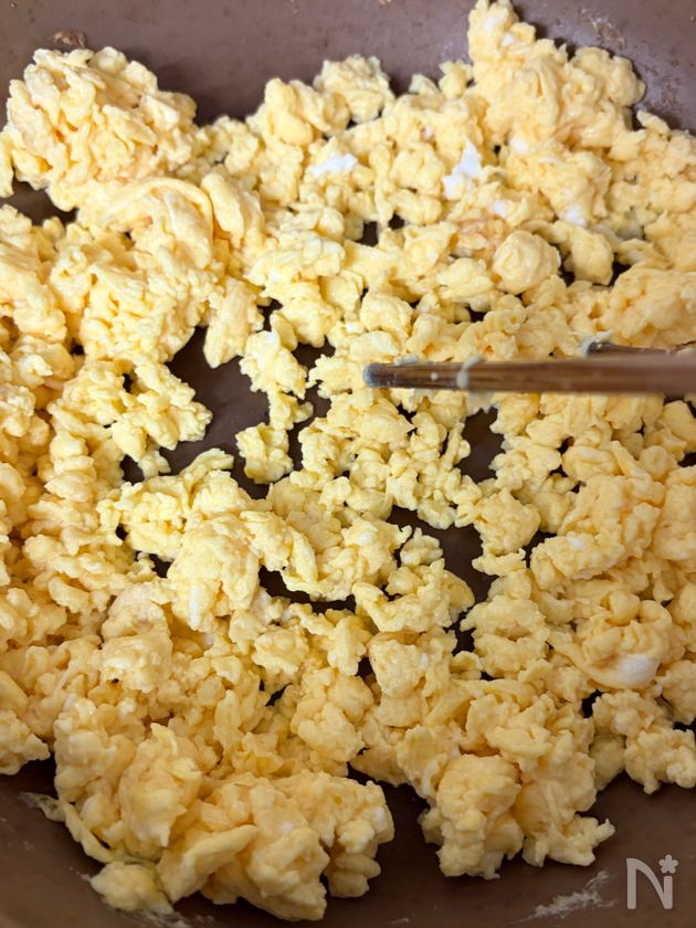 熱したフライパンに油(分量外)を引き、炒り卵を作る。