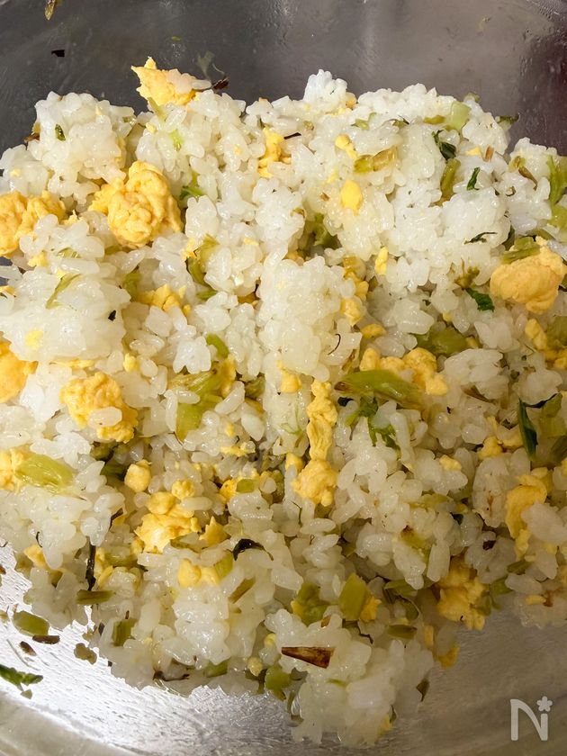 (3) 温かいごはんに、①の炒り卵、②のかぶの葉を加えてよく混ぜる。