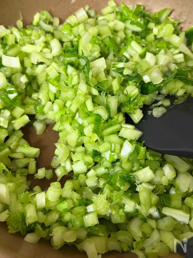 熱したフライパンにごま油を引き、かぶの葉を入れて炒める。しんなりしてきたら塩を加えて、水分が飛ぶまで炒める。