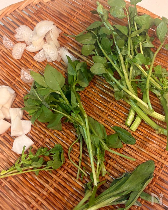 すずな(かぶ)とすずしろ(大根)は薄切りにする。