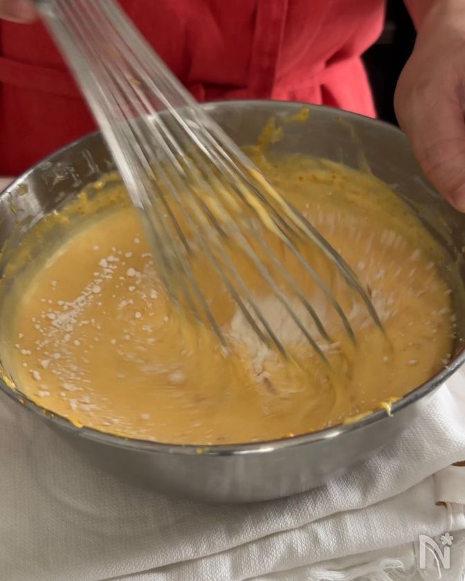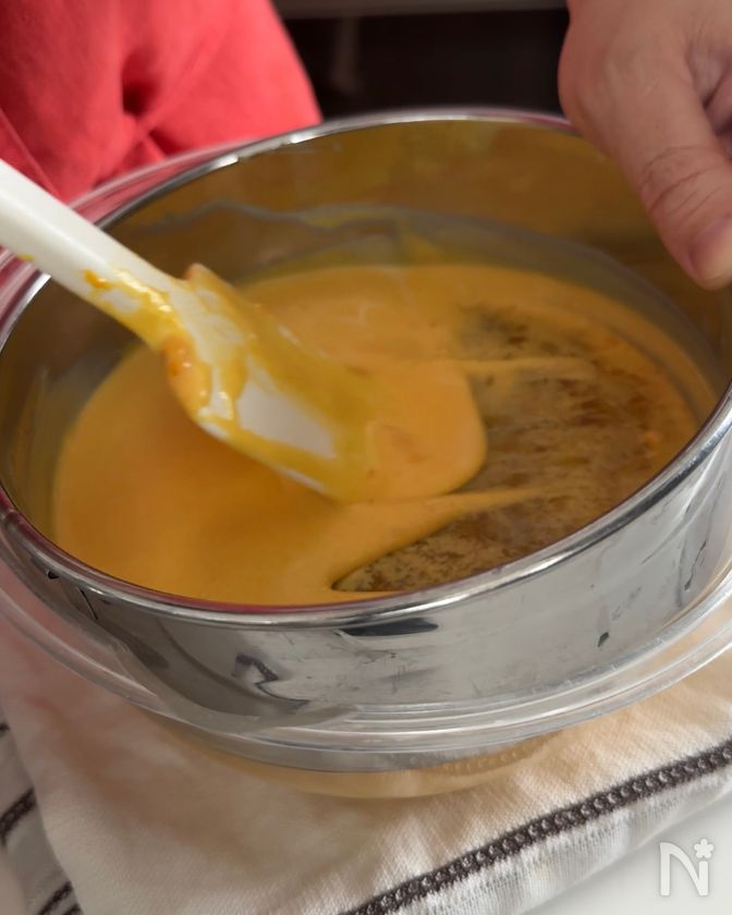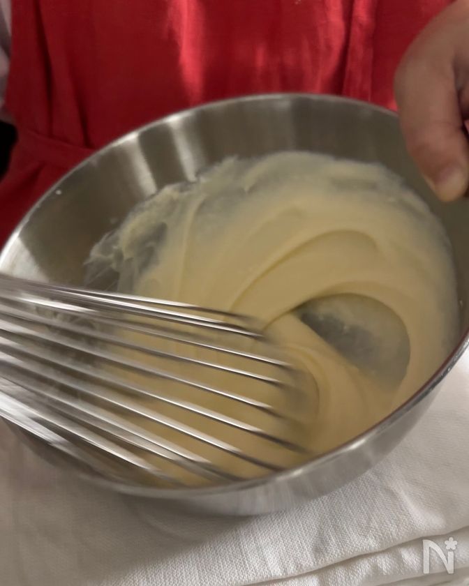 (4) 生クリームを数回に分けて加え、薄力粉を加えて混ぜる。