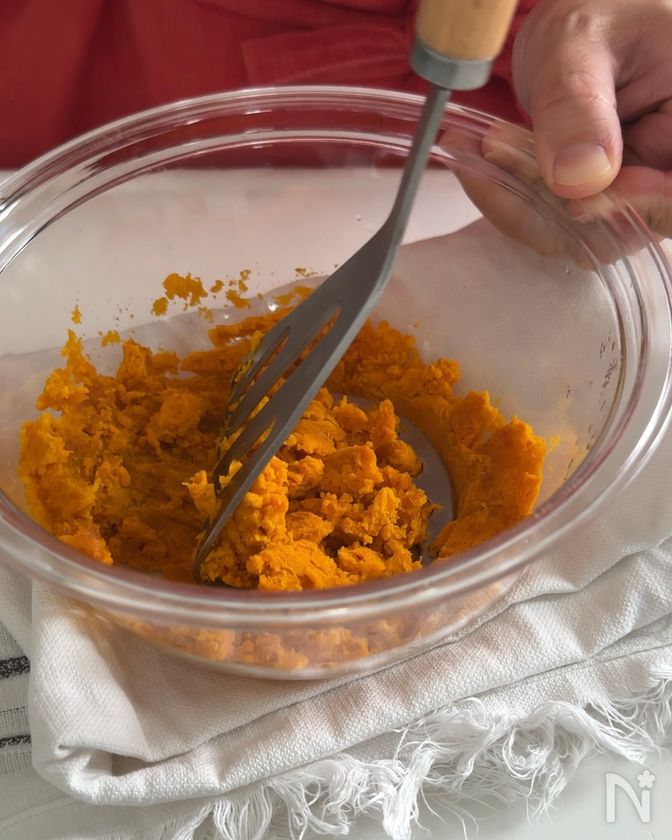 種、ワタ、皮を剥ぎ、ひと口大に切ったら、耐熱容器に入れてふんわりラップをし、電子レンジ(600W)で、5分30秒加熱する。取り出したら、熱いうちにマッシャーなどで潰す。