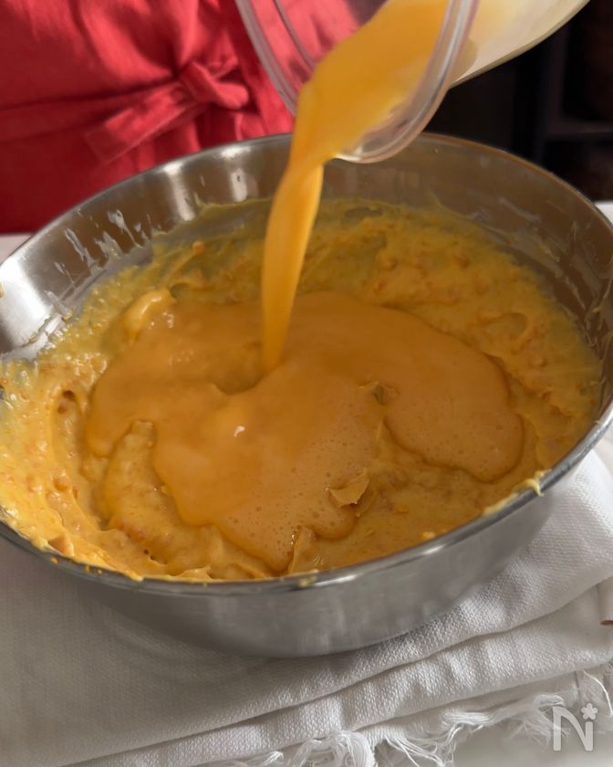 (3) ①のかぼちゃを加えて混ぜたら、溶き卵を加えて混ぜる。