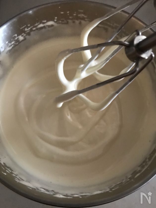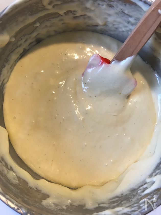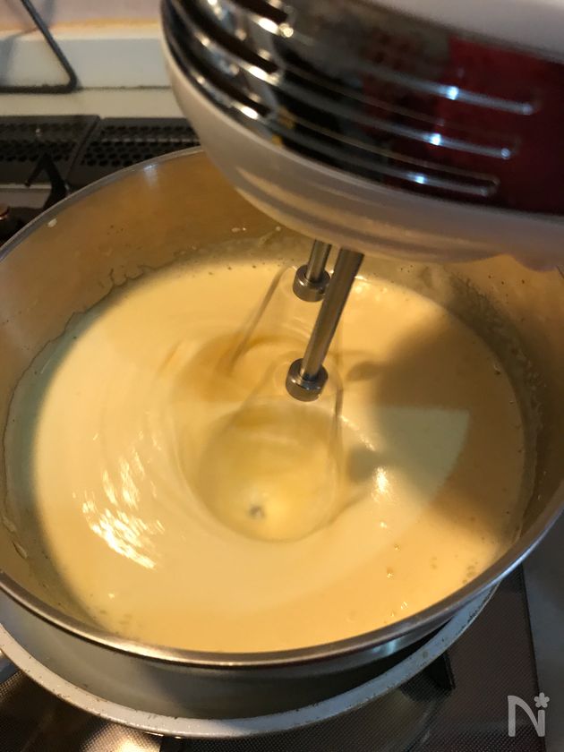 (2) 卵が温まりもったりとして、ボールの中でリボンが描けるようになるまで混ぜます。湯煎から外します。ハンドミキサーを低速に切り替え気泡を小さく整えます。バニラビーンズまたはバニラエッセンスを入れ混ぜます。