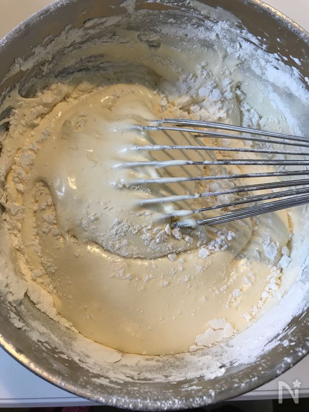 (3) ふるっておいた薄力粉を入れて切るように混ぜます。泡立て器で混ぜても良いです。ゴムベラで混ぜても良いですよ。