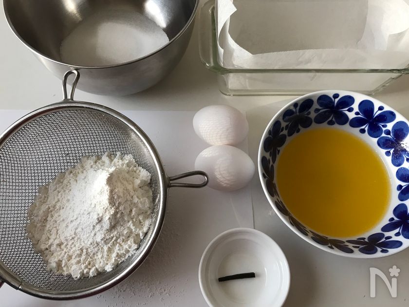(下準備) 材料を準備しておきます。薄力粉はふるっておきます。バター(無塩)は湯煎又はレンジで溶かしておきます。