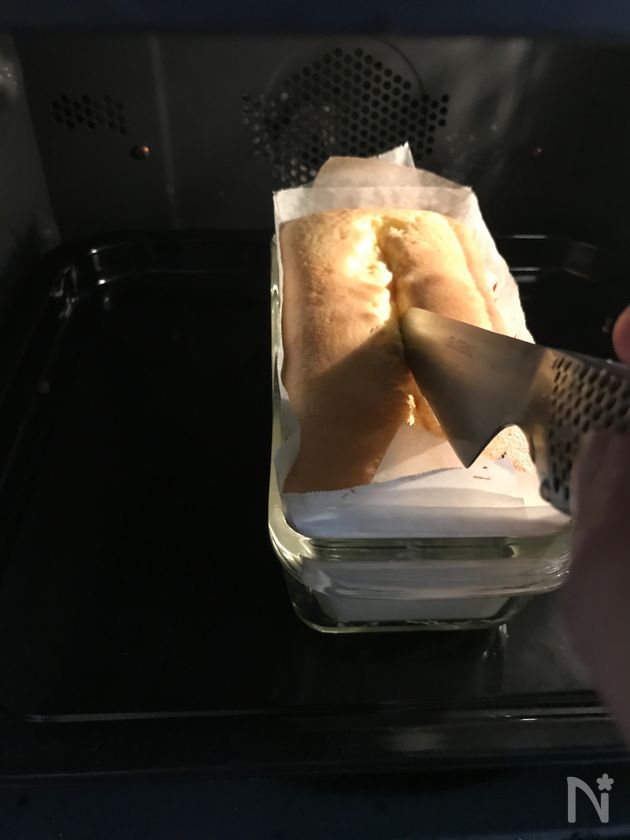 (5) 出来上りの生地です。オーブンシートを敷いた型に流し込み、布巾を敷いた台の上にとんとんと軽く落として中の空気を抜きます。