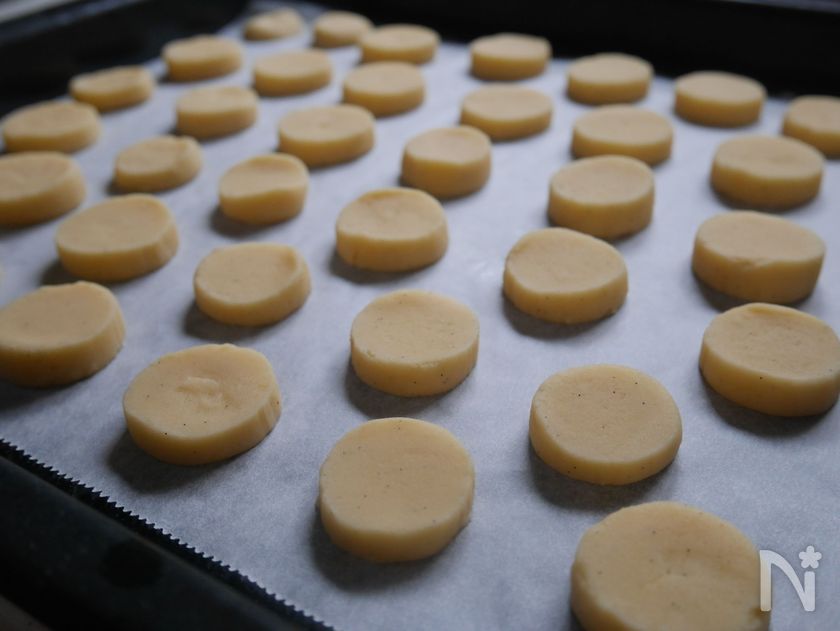 ここでオーブンを180度に予熱し、その間天板ごと冷蔵庫で冷やしておく。