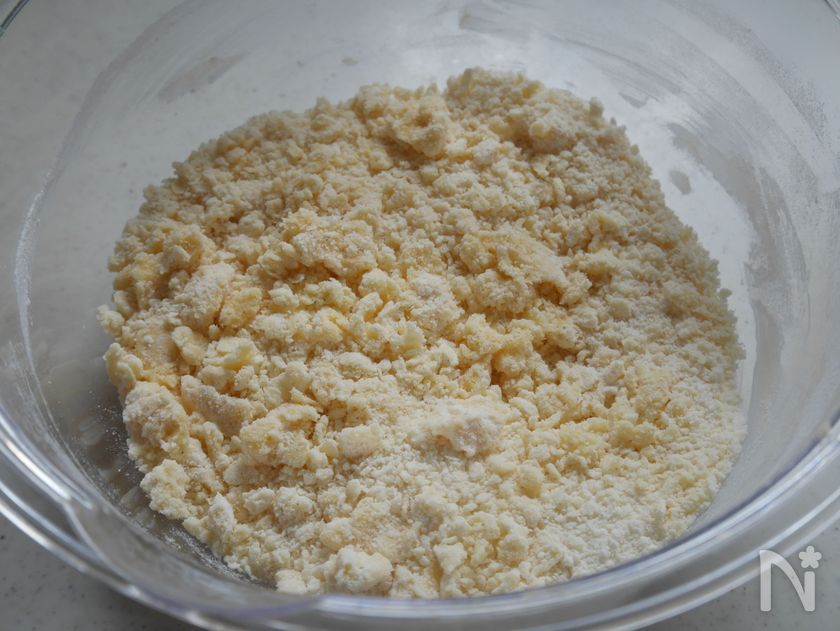 最初は写真のようにぽろぽろですが、手でぎゅっぎゅっとこねるように混ぜていくうちに手の熱でバターが程よく溶けて、まとまります。