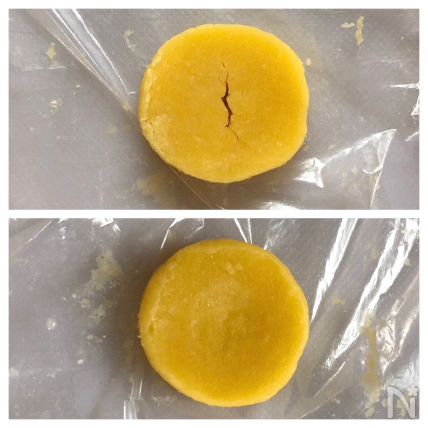 (6) 形を整える際、クッキーの真ん中に亀裂が入ってしまったら、丸く形を整えながら、亀裂が入った真ん中の部分を薄くするイメージで指で押すと、亀裂が消えます。