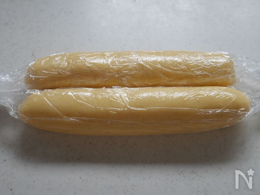 (4) 生地を2つに分けてラップに乗せて、ぎゅっとして生地の中の空気を抜くようにしてまとめてから棒状にする。