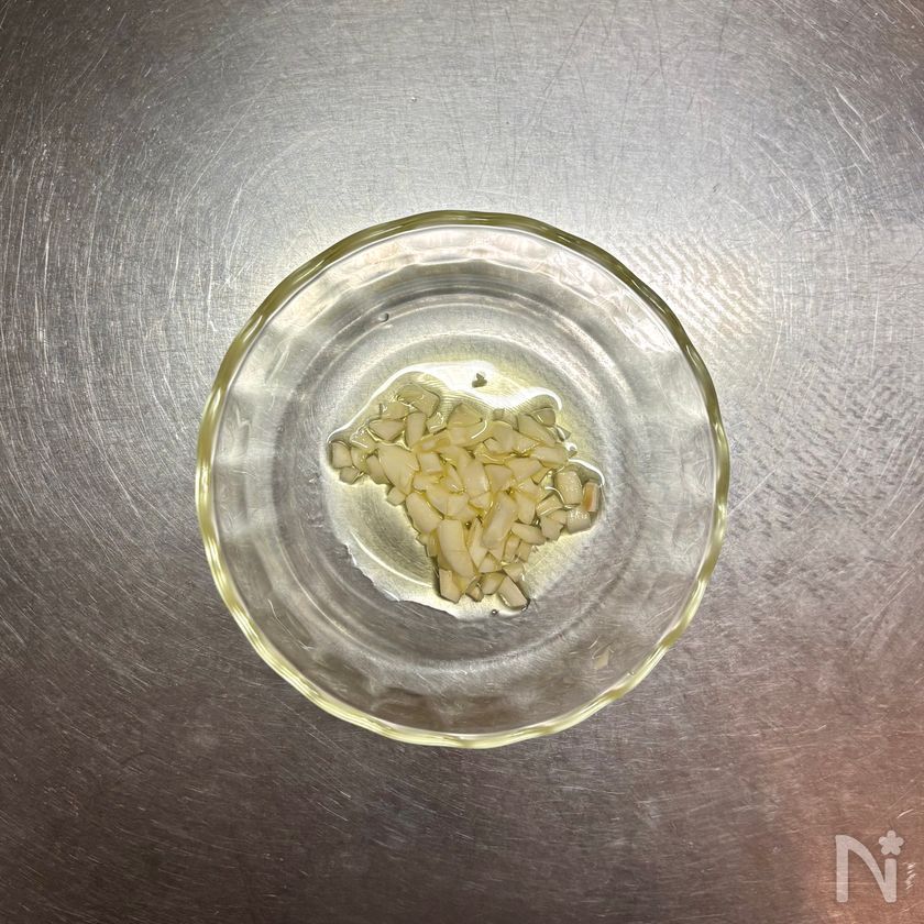 にんにくは粗みじん切りにして小さめの耐熱ボウルに入れ、サラダ油を回しかける。