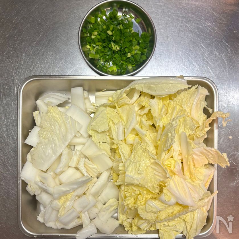 (1) 白菜は葉元と葉先に切り分け、葉元は繊維を断つように2cm幅に切り、葉先は4cm四方に切る。