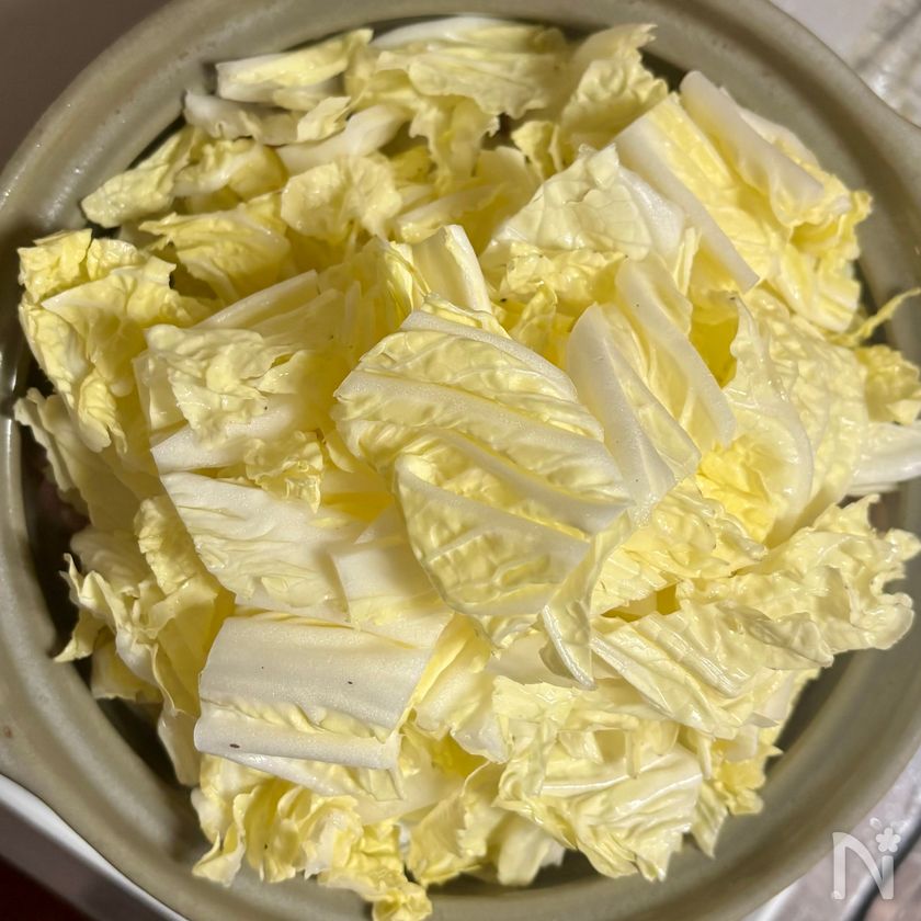豚肉に白菜の葉先をのせ、再びふたをして白菜が柔らかくなるまで弱火で10分ほど蒸し煮にする。
