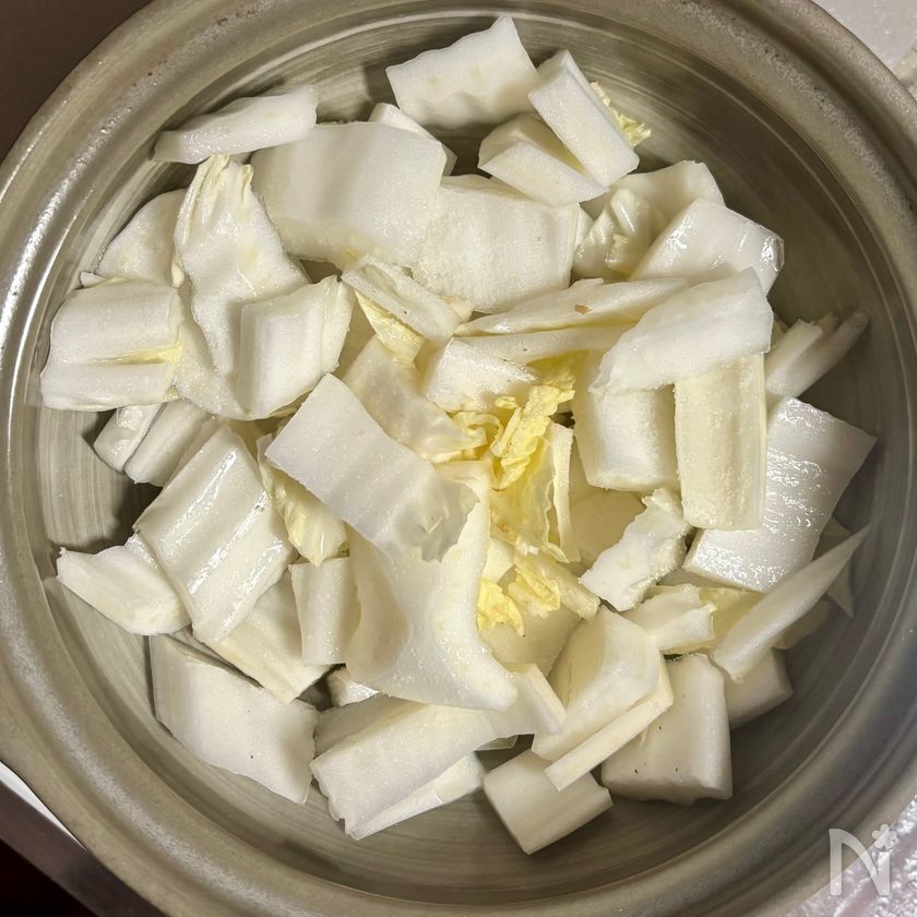 (3) 土鍋に白菜の葉元を敷き、水カップ1/4を加えて塩をふり、中火にかける。