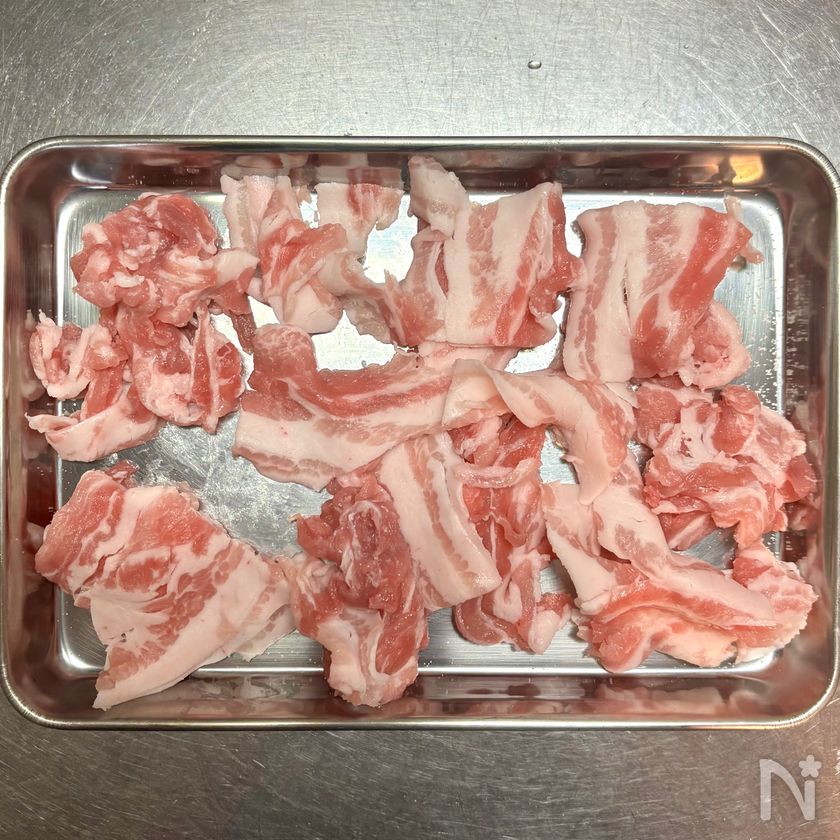 (2) 豚バラ肉は3cm幅に切り、【A】をふる。