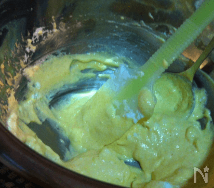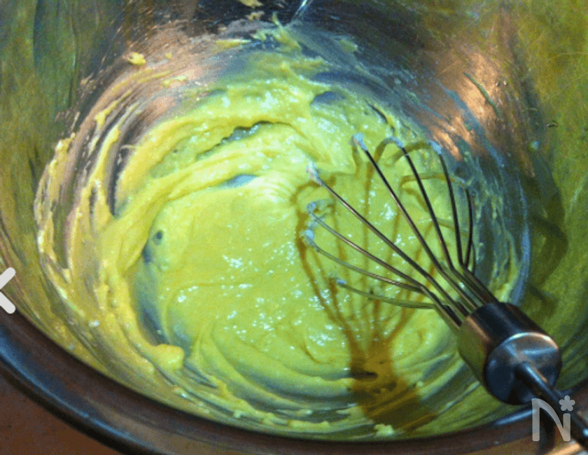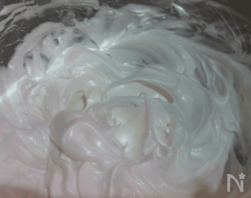 (3) ①に②のメレンゲを半分入れて混ぜる。軽く混ぜたら、残りの半分を入れふんわり切るように混ぜる。決して混ぜすぎない事。メレンゲがまだ見えるくらいで良い。