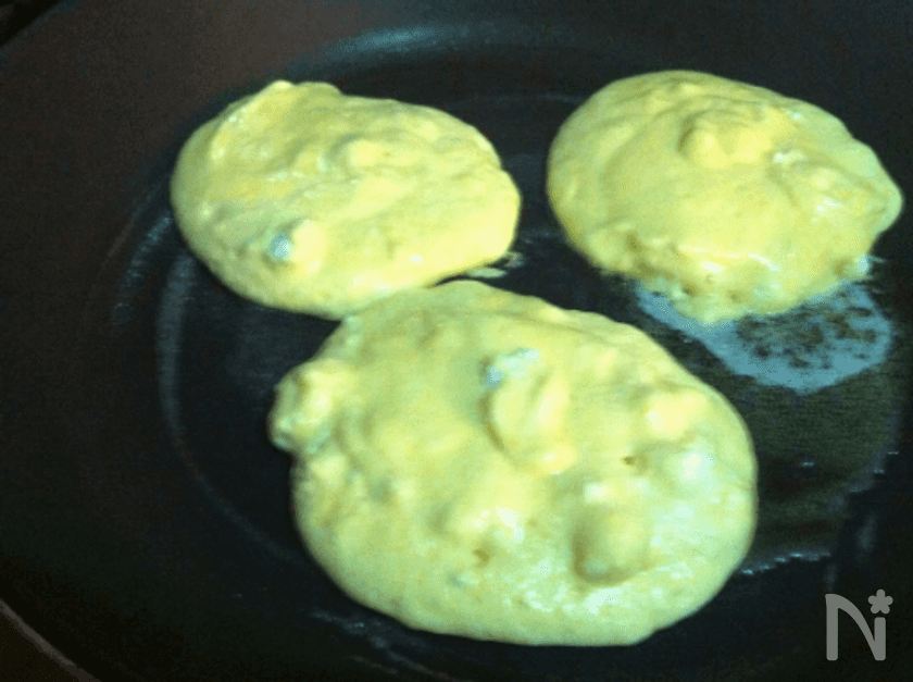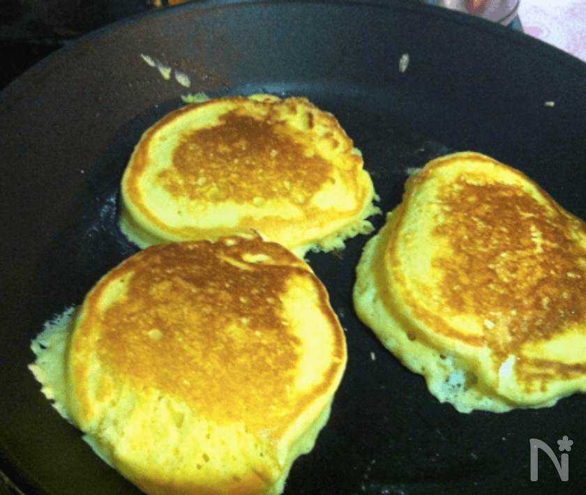 弱火で片面3〜4分くらい。まわりが少し乾いてきたらフライ返しでひっくり返す。普通のホットケーキみたいにぷつぷつ穴はあかないです。きれいな焼き色がついたら出来上がり。焼き立てを味わって。