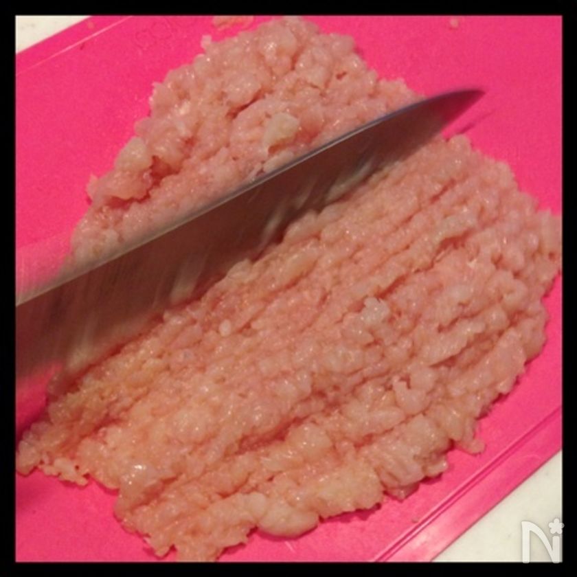 (3) 鶏胸肉の皮や筋を取ったら、粗めのミンチ状になるまで包丁で叩く。