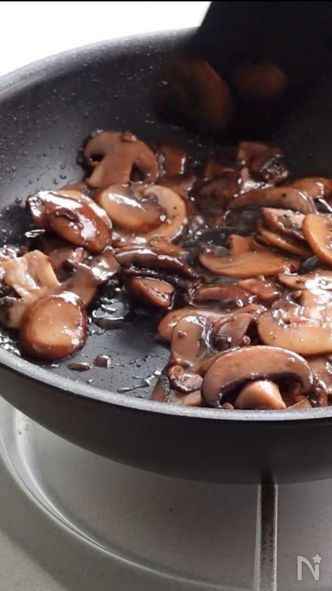 (2) フライパンにマッシュルーム、オリーブオイルを入れ中火にかける。1分程炒めたら赤ワイン、塩、粗挽き黒胡椒を入れ水分がなくなるまで煮詰める。