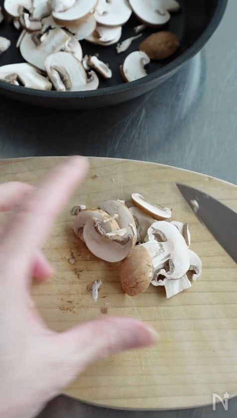 (1) マッシュルームは汚れを拭き、軸の先を少し切り落とし、薄切りにする。